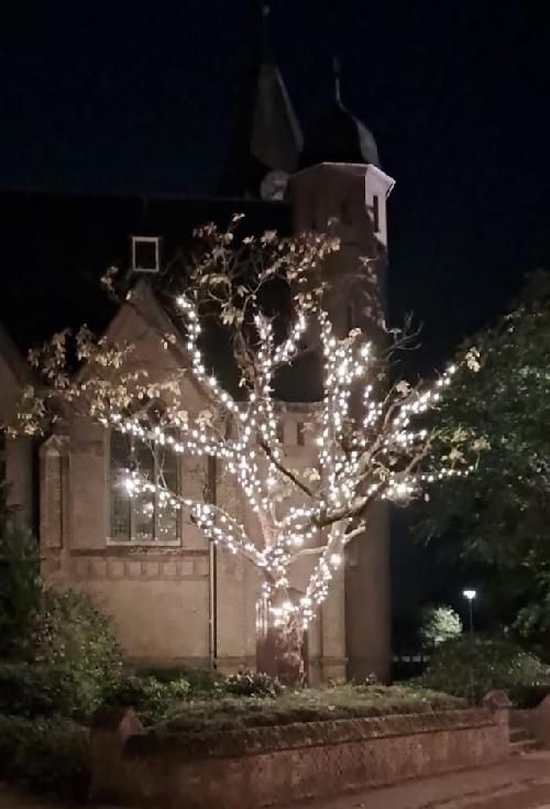 Op initiatief van enkele enthousiaste parochianen is onder leiding van Jos Timmermans, samen met Ad van Lexmond en zijn zoon Ad, een prachtige boom voor de Sint-Willibrorduskerk in Esch versierd met maar liefst 1.000 kerstlampjes. Een oase van licht die warmte en verbondenheid symboliseert, geflankeerd door twee nieuwe vlaggenmasten.