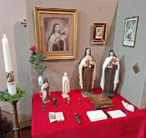 Komend jaar (2026) wordt dit gevierd, maar zondag was daarvan de start. Immers deze maand 100 jaar geleden werd de eerste steen gelegd. In de kerk wees Chris op een speciaal voor het 100-jarig bestaan van de kerk ingerichte gedenkplek en de mogelijkheid om bij beeltenissen van de Heilige Theresia van Lisieux een gedicht, spreuk of persoonlijke boodschap te schrijven die volgend jaar dan verwerkt worden in de viering ter gelegenheid van de 100-jarige kerk.