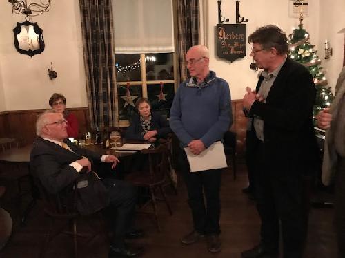 Even later werd hij door Johan Onland, de voorzitter van het kerkkoor, toegesproken en in het zonnetje gezet. ‘Je was ontzettend deskundig, betrokken én muzikaal. Steeds waren de repetities tot in de puntjes voorbereid en steeds wilde je van ons koor het onderste uit de kan’, aldus Johan. ‘En dat wilden we ook: keurige Latijnse missen verzorgen in onze eigen kerk van Liempde door goed te zingen...’ ‘Maar jullie hebben vanavond ook geweldig gezongen’, antwoordde Ben, ‘en jullie zijn nog steeds een fijne eenheid, die staat als een huis. Mijn complimenten.’ De koorleden en de (nieuwe) dirigent keken verguld. Ben Lamers kon laat op de avond naar huis met een kistje lekkere drank; het zij hem van harte gegund!