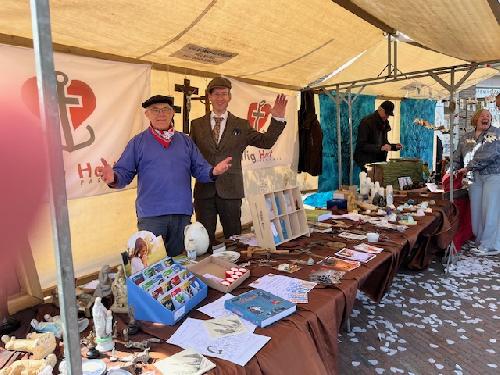 In de kraam lag allerhande documentatie over de parochie: folders, flyers, affiches, boekjes, oude bijbels, etc. Vanzelfsprekend was er ook van alles te koop. Zo lagen er tientallen spullen van mensen die vaker iets aan de parochie schenken en spullen die elders verkregen waren. Ook veel andere zaken, gekregen en gekocht gingen in de verkoop. Vooral ook de gekregen wijwaterbakjes waren erg in trek. De ‘handel’ liep goed en we konden een aardig bedrag aan de parochiekas en een ander goed doel toevoegen.