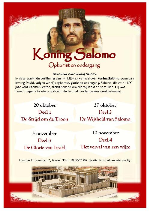 Filmcyclus over koning Salomo. In deze boeiende verfilming van het Bijbelse verhaal over koning Salomo, zoon van koning David, volgen we zijn opkomst, glorie en ondergang. Salomo, die zo’n 1000 jaar vóór Christus leefde, stond bekend om zijn wijsheid en spreuken. Hij was tevens degene in wiens opdracht de tempel van Jeruzalem werd gebouwd.